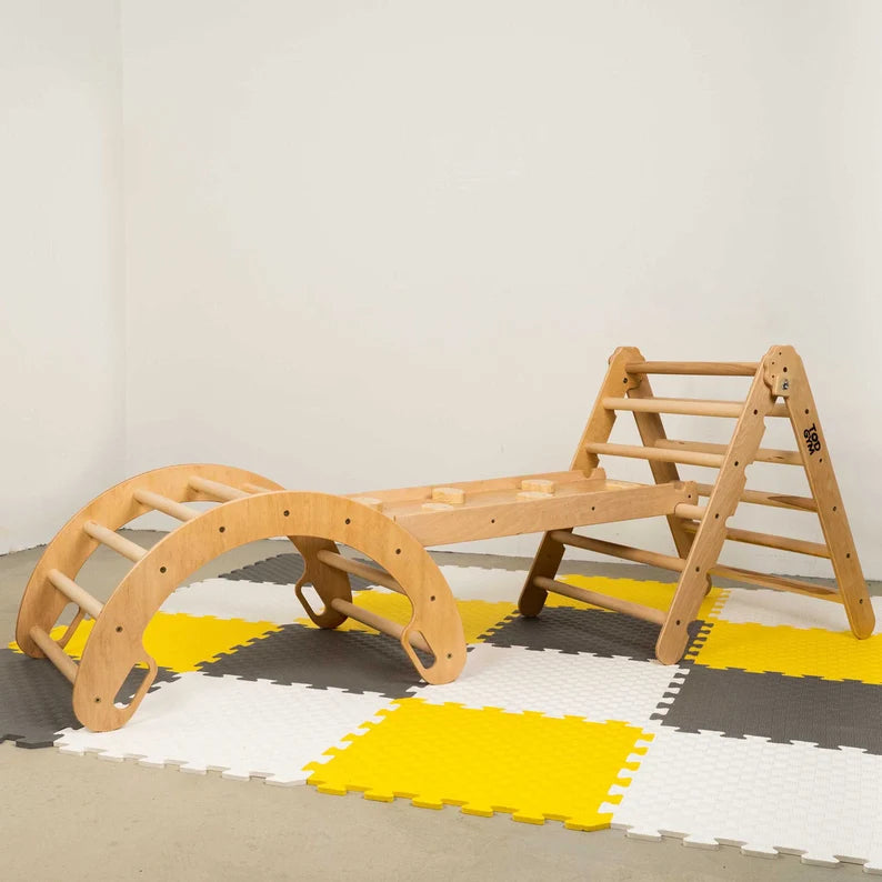 The Montessori-inspired Climbing Set 4in1 is a versatile and engaging developmental tool designed for toddlers. Having educational philosophy, these triangles with arches, slides and climbing walls promote physical activity, balance, coordination, and cognitive skills in a playful and exploratory manner. Consisting of a sturdy wooden frame with four interconnected components, the set for kids offers a safe and secure environment to climb, crawl through, and interact with.